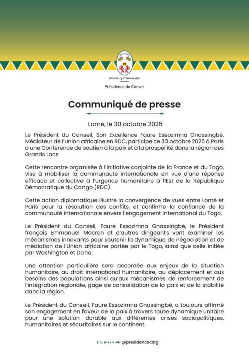 Le Président du Conseil, Faure Essozimna Gnassingbé, participe ce mercredi 30 octobre 2025 à Paris à la Conférence de soutien à la paix et à la prospérité dans la région des Grands Lacs, organisée conjointement par la France et le Togo.