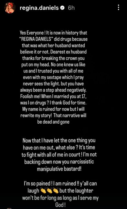 « Oui, tout le monde sait maintenant dans l’histoire que Regina Daniels prenait de la drogue parce que c’est ce que mon mari voulait qu’on croie. Quand j’avais 17 ans et que je t’ai épousé, est-ce que j’étais droguée ? »